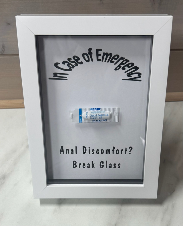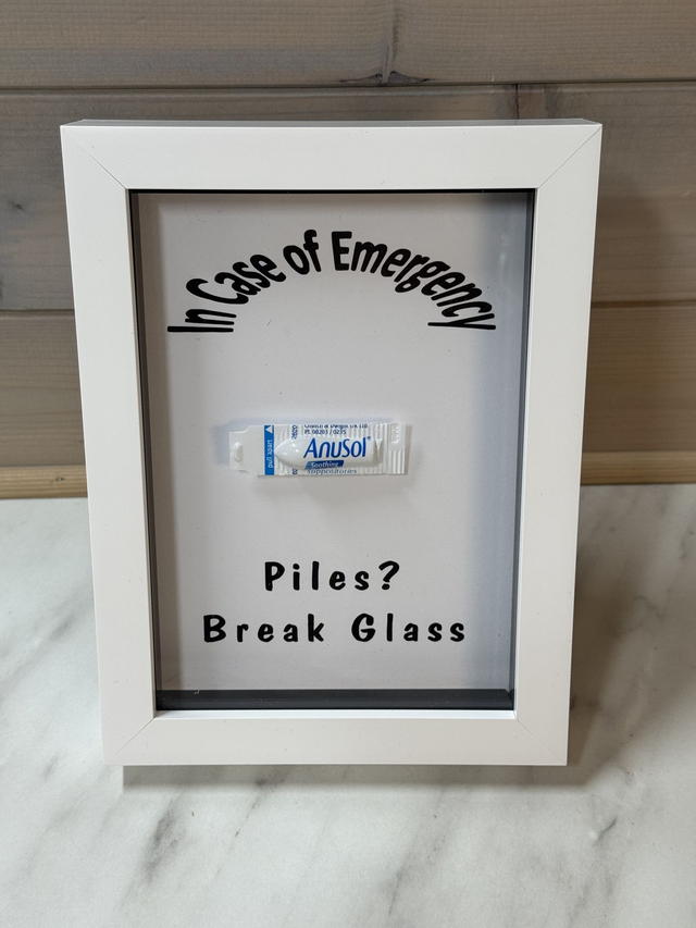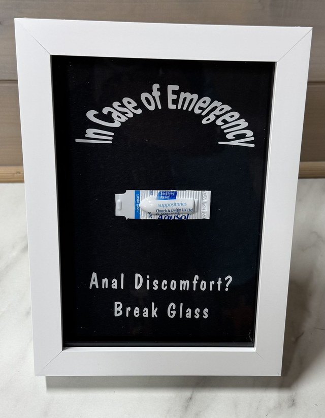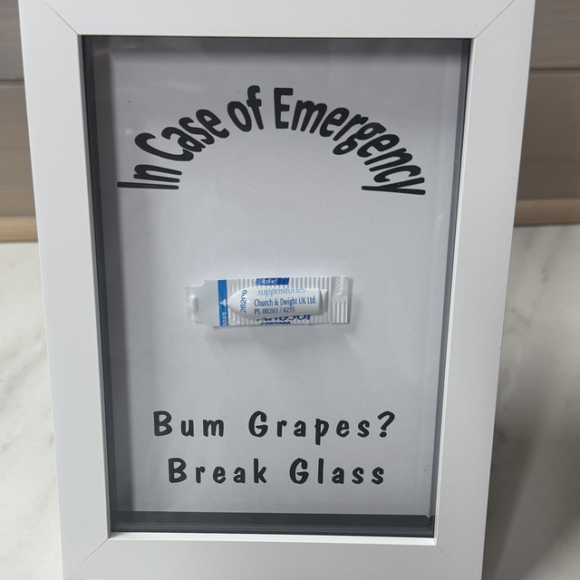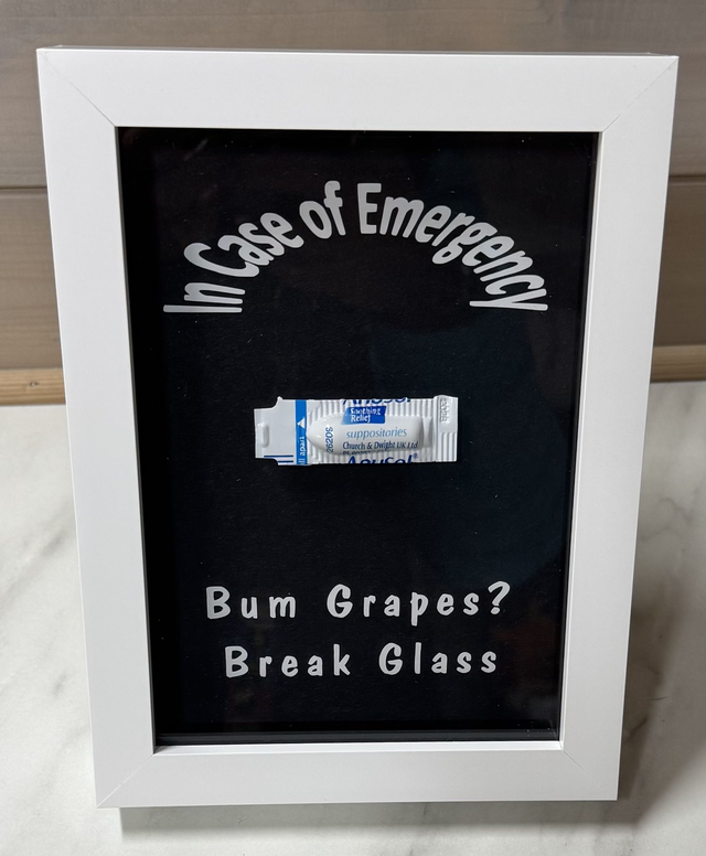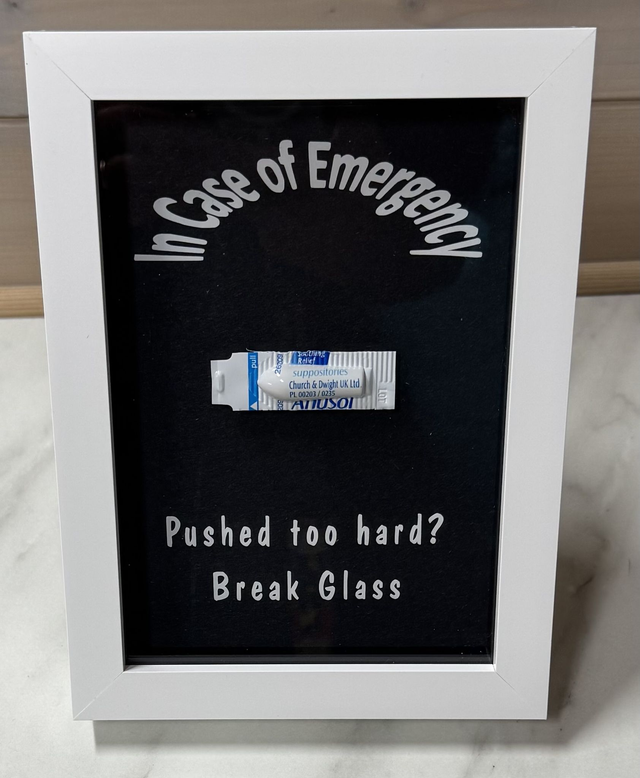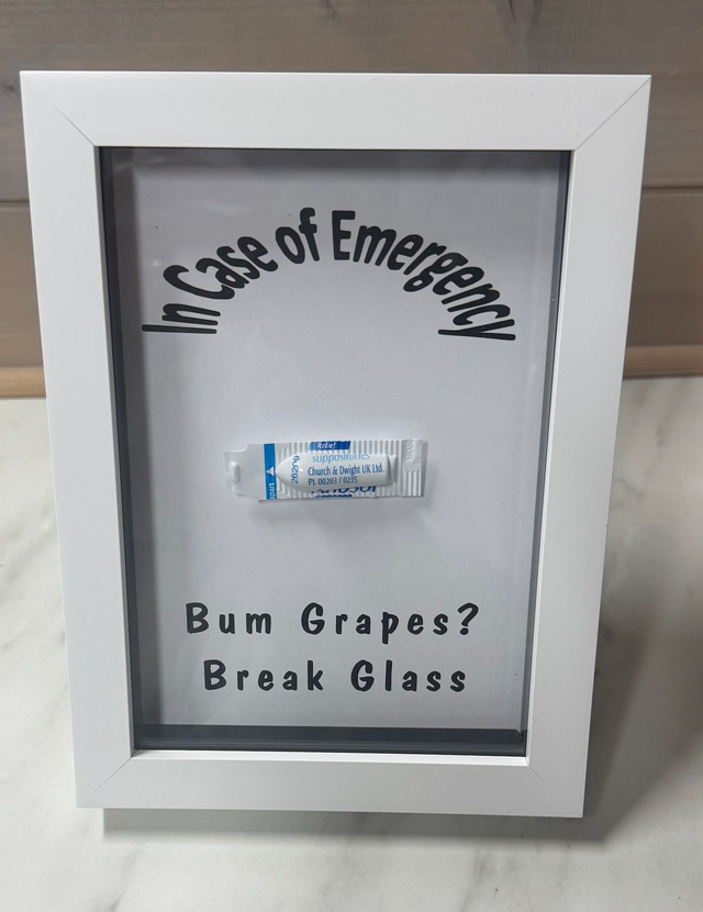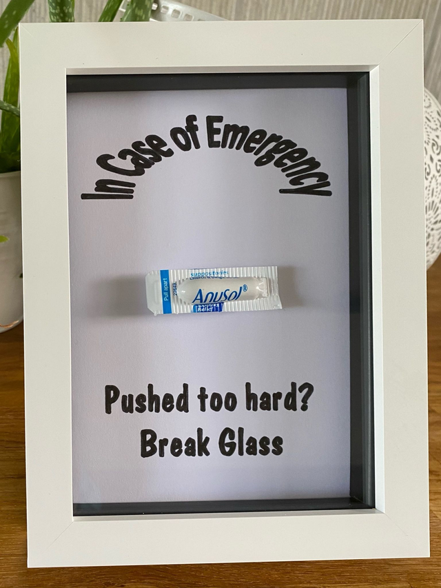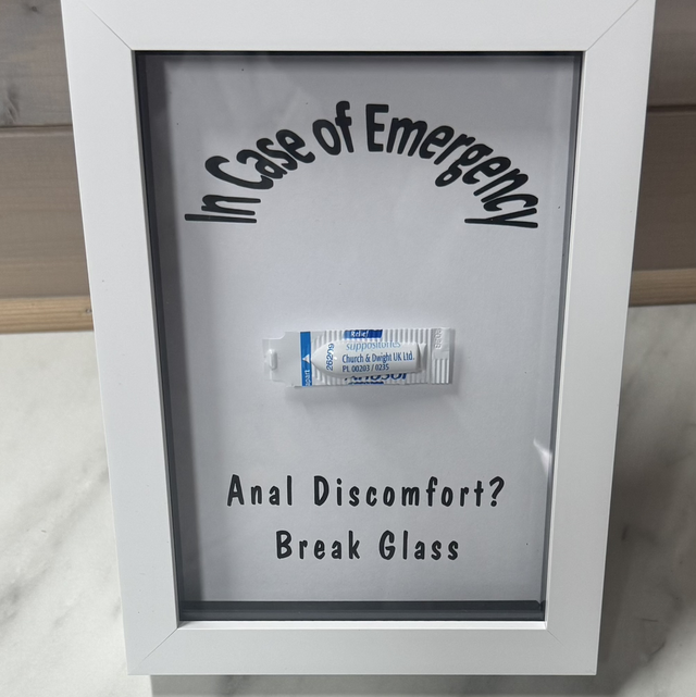Please bear in mind that the front of the frame is glass and therefore I do not recommend that you actually break the glass. This could lead to injury and I don't think you'll be able to use your anusol suppository as a bandage :)